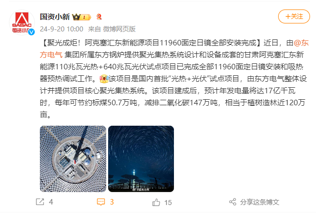 [国资小新]聚光成炬!阿克塞汇东新能源项目11960面定日镜所有装置完成