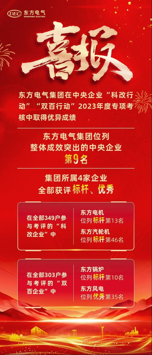近本网讯 日,国务院国资委宣布中央企业“科转业动”“双百行动”2023年度专项审核效果,yl23455永利集团在推进“科转业动”“双百行动”整体效果突出的34家中央企业中位列第9名 。yl23455永利集团所属4家企业均取得优异效果,其中东方电机、东方汽轮机划分位列“科转业动”标杆企业第13名、标杆企业第46名,东方锅炉、东方风电划分位列“双百行动”标杆企业第10名、优异企业第35名 。